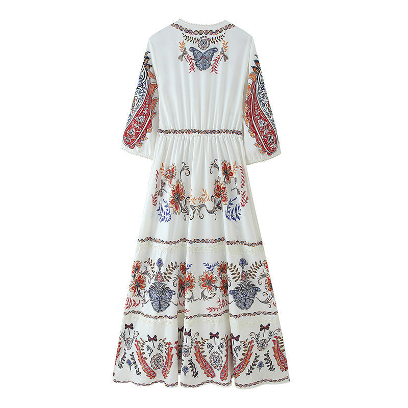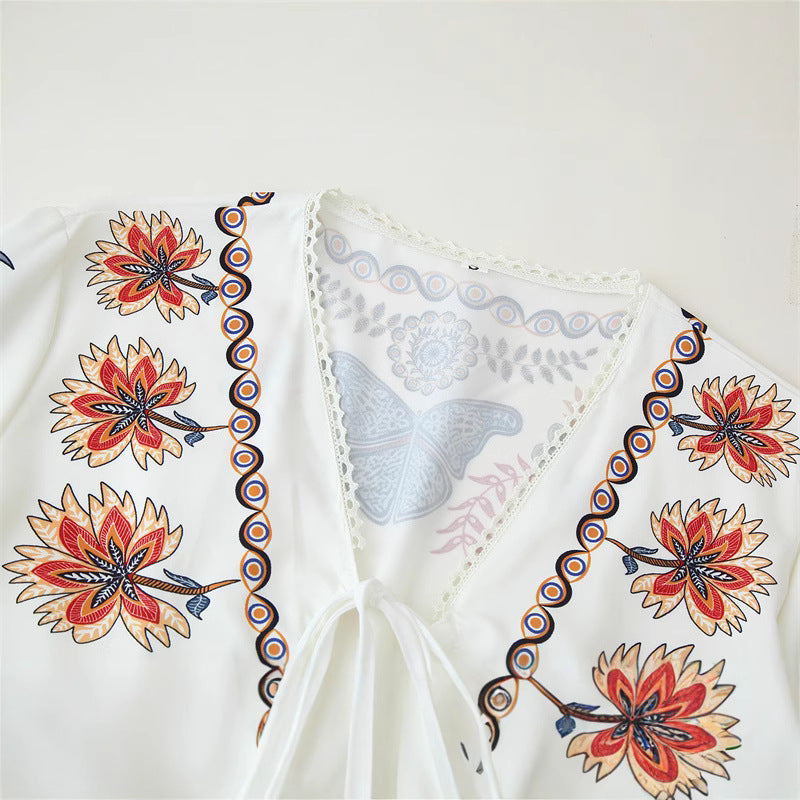 فستان دانتيل بفتحة رقبة على شكل حرف V مع طباعة وخياطة