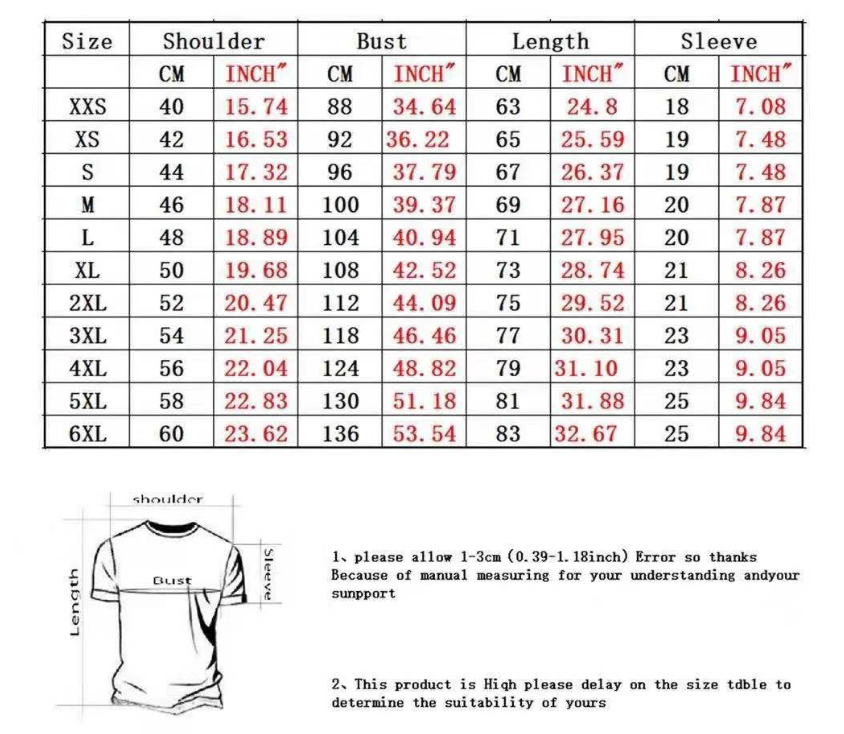 المقاس: XXS، XS، S، M، L، XL، XXL، XXL، XXXXL، 5XL، 6XL،
