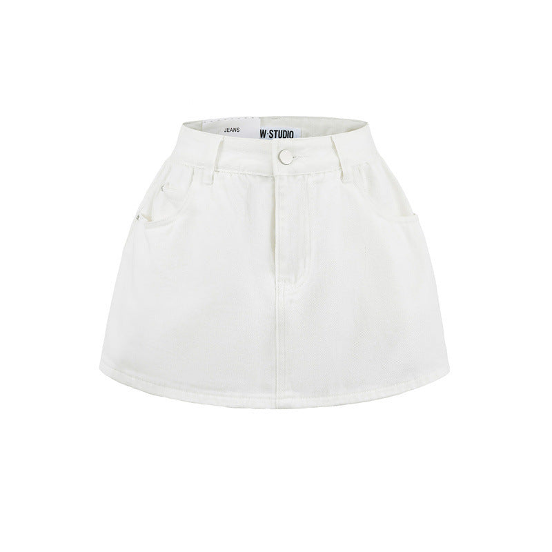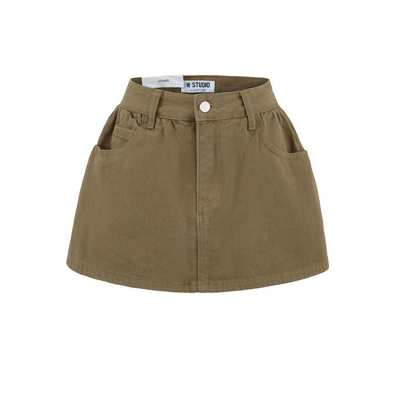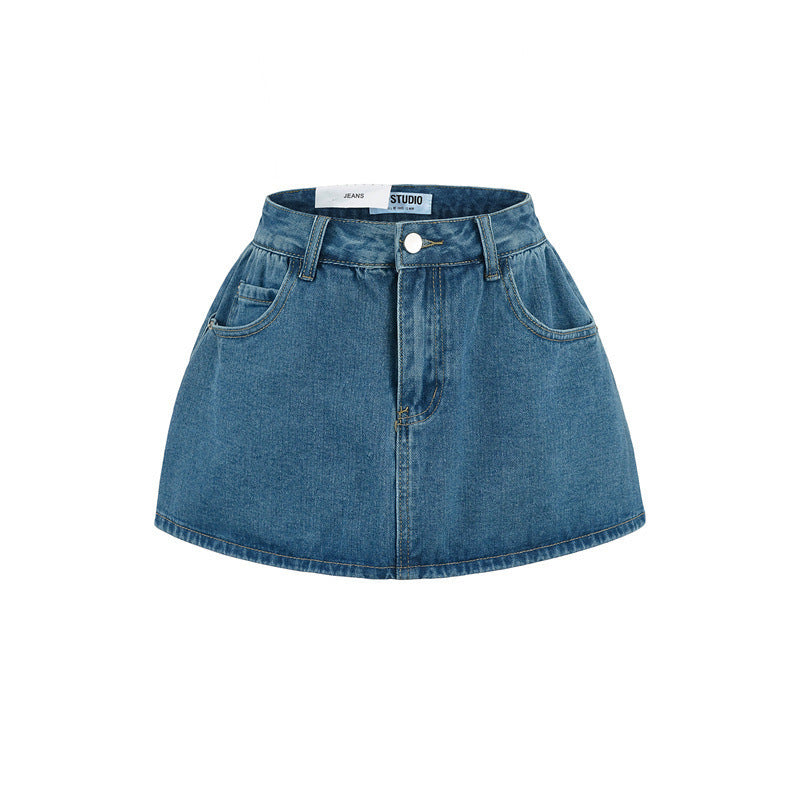 Retro Mid-low Waist Anti-exposure Denim A- Line Bubble Short Skirt