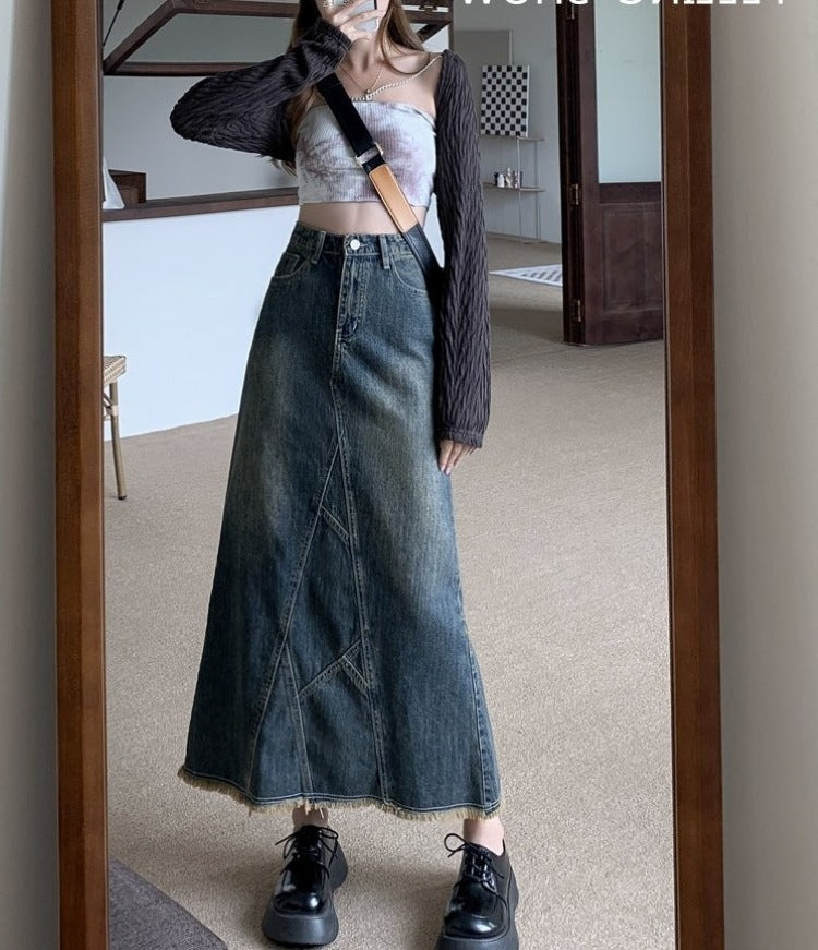 Retro denim skirt for women summer high waist back slit medium long slim a-line skirtRegular price 21.85USDSale price 21.85USD Regular priceUnit price per -