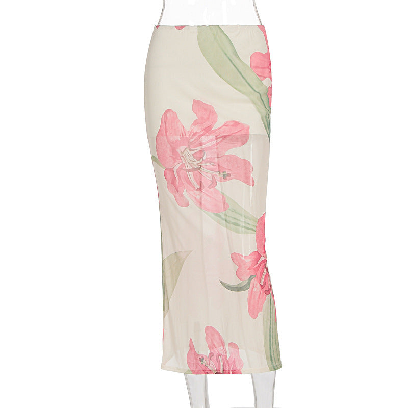 Dopamine Beach Vacation Pure Desire Style Printed Mesh Sheath Skirt