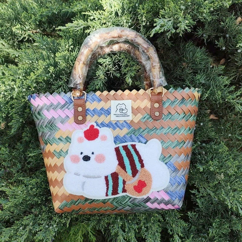 Color: blue bamboo handle basket with green scarf dog, gray bamboo handle basket with schoolbag dog