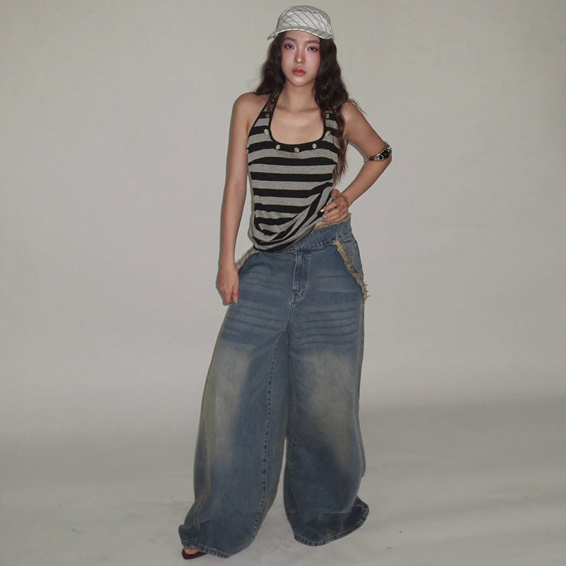 Hot Girl Comfortable Design Sense Striped Spaghetti Straps Female U Collar Sexy