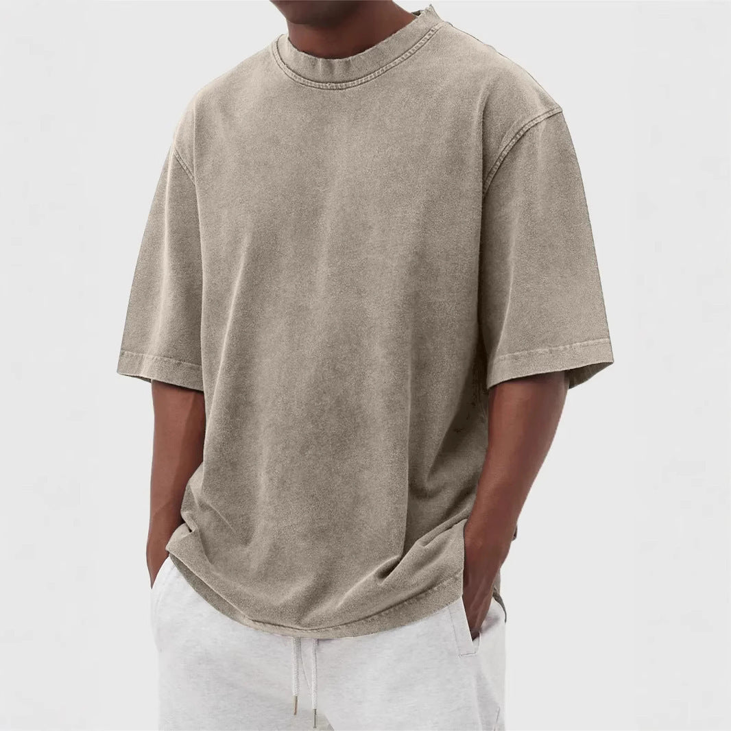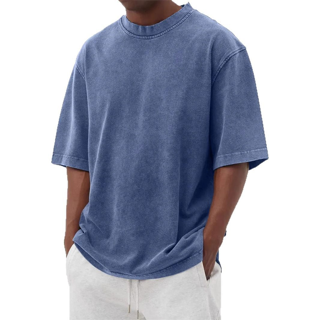 Men's Washed Fried Color Distressed Solid Color Pullover Short T-shirt