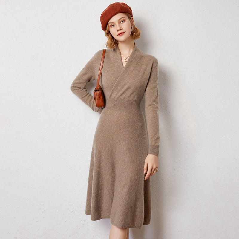 Mid-collar Long Slim Cross Over-the-knee V Cashmere Dress