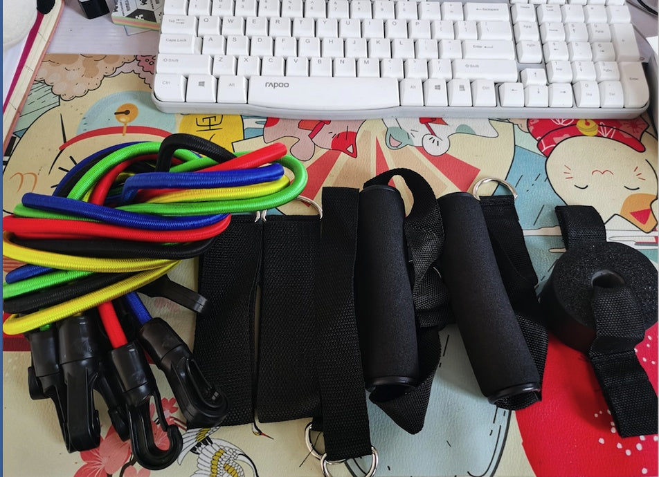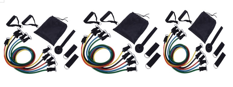 5 * elastic bands: black (30 lbs), blue (25 lbs), red (20 lbs), green (15 lbs), yellow (10 lbs)