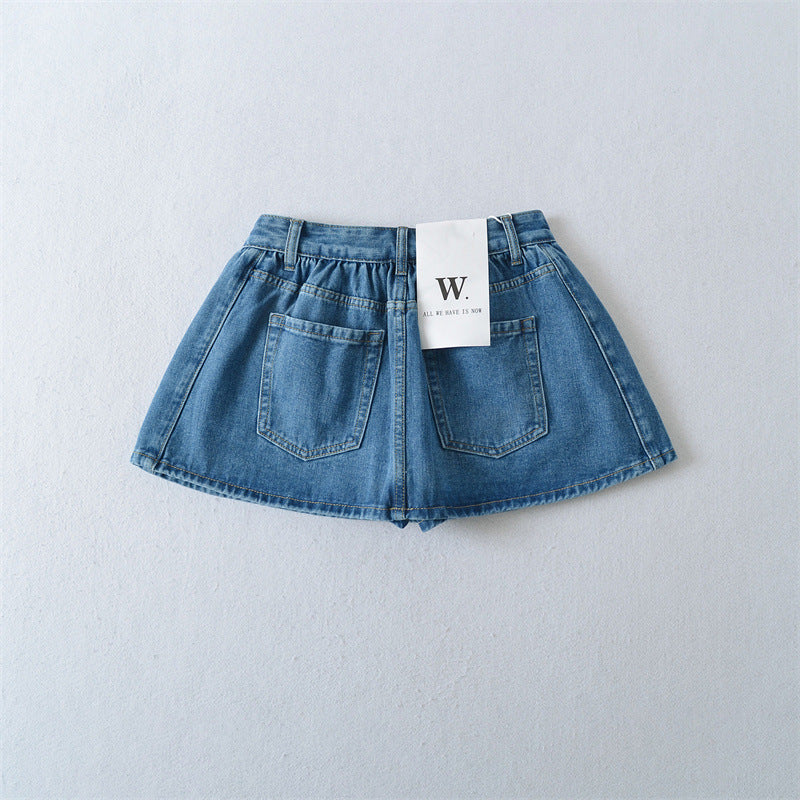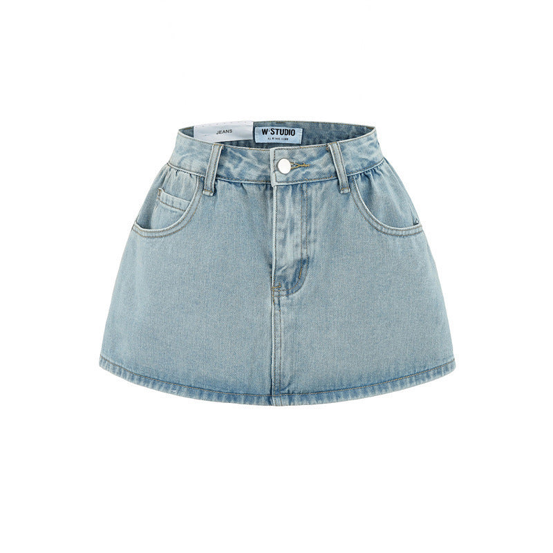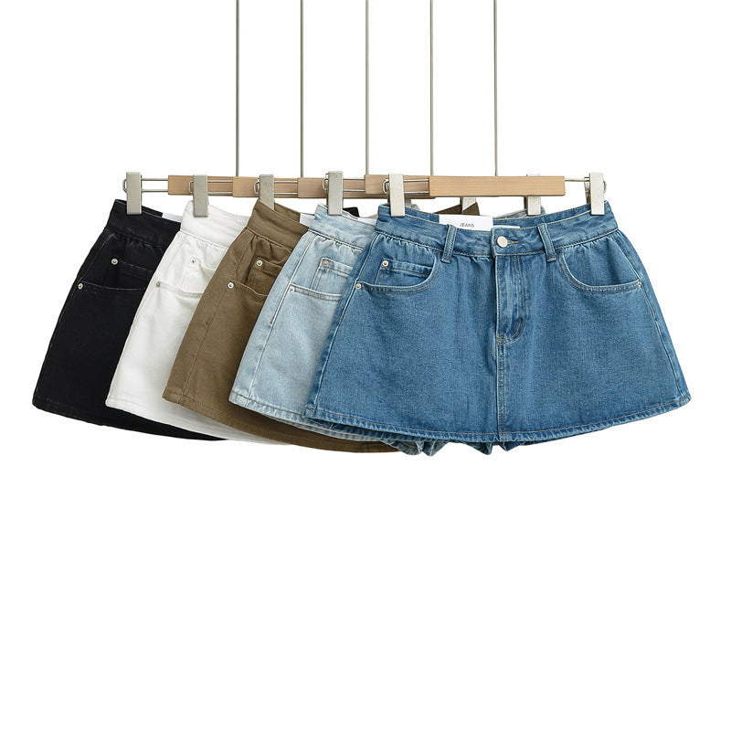 Retro Mid-low Waist Anti-exposure Denim A- Line Bubble Short Skirt