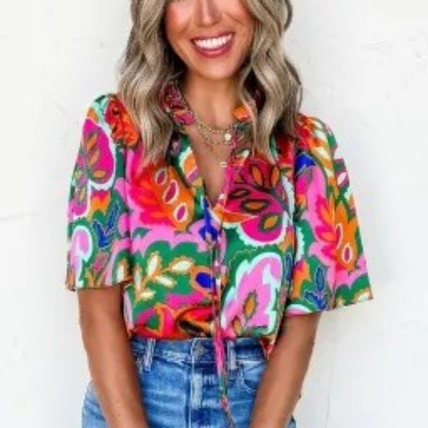 Rose Summer Plant Print Lace Up V Neck Short Sleeve Blouse
